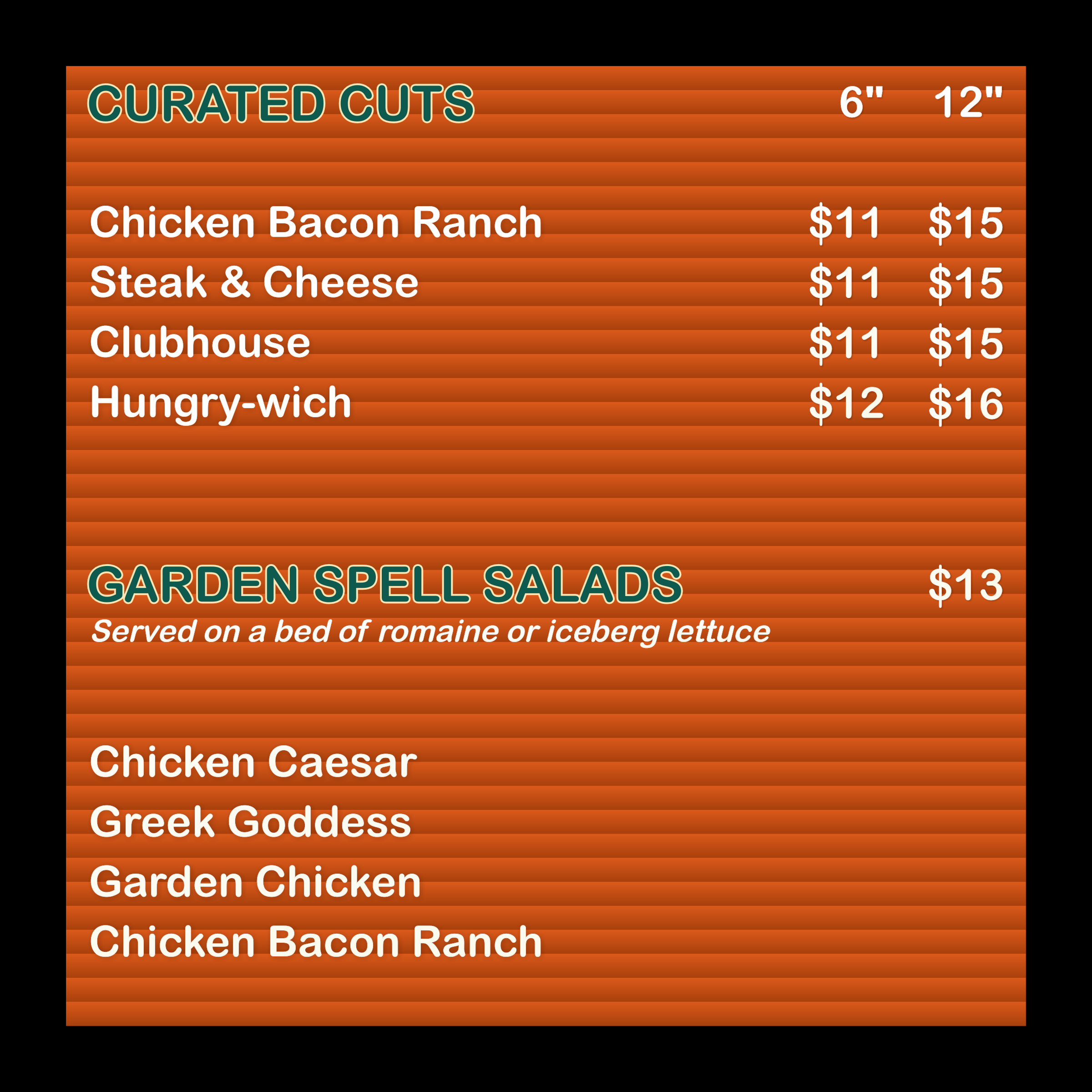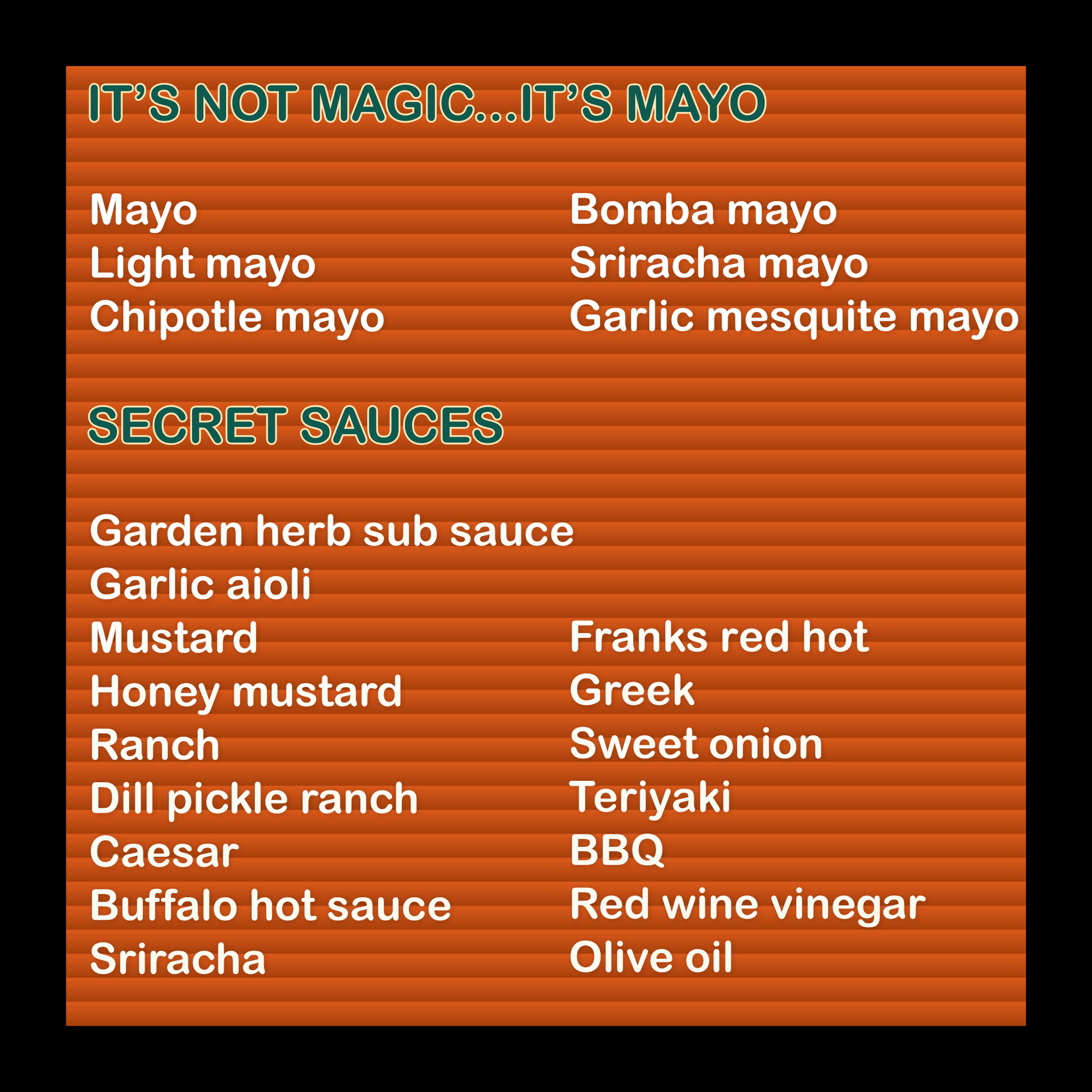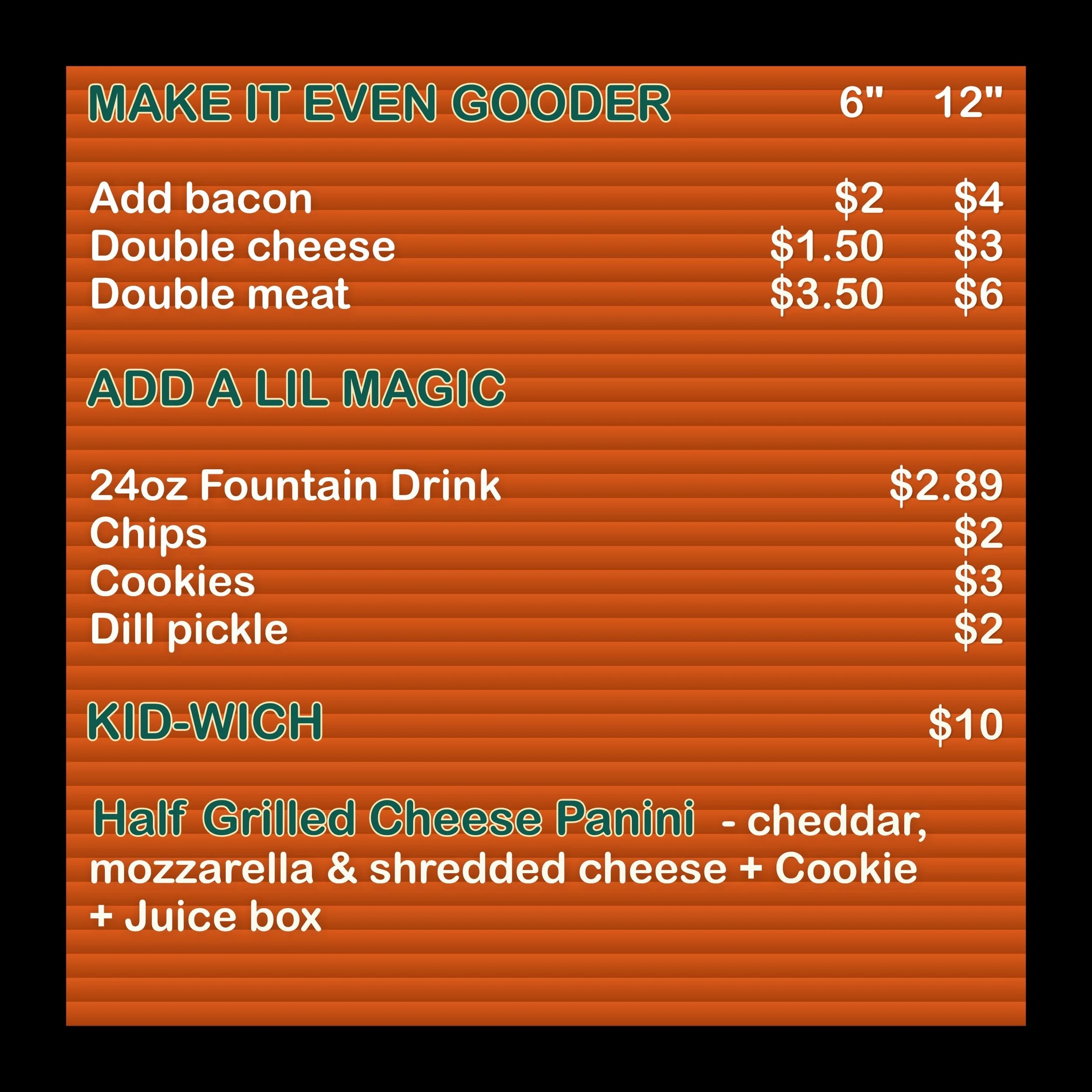 THE menu. It’s not magic… It’s mayo. Melted magic paninis $14 All served on toasted sourdough B.L.T. Applewood smoked bacon, sliced tomato, lettuce, cheddar cheese, mayo & honey mustard Spicy-Wich Genoa salami, hot capicola, provolone, bomba mayo, arugula, spicy antipasto, muffuletta, mustard & hot honey balsamic reduction & pesto Pesto Turkey Smoked turkey, provolone, diced tomato, arugula, balsamic reduction & pesto *make it spicy - add jalapeno & hot honey Grilled Cheese Applewood smoked bacon, cheddar, mozzarella, & shredded cheese *make it spicy - add jalapeno & hot honey Clubhouse Applewood smoked bacon, smoked turkey, black forest ham, cheddar, sliced tomato, lettuce, mayo & honey mustard Wicked wraps $14 Regula & Gluten Free Wraps Chicken caesar All white chicken, applewood smoked bacon, crisp romaine, housemade croutons, caesar dressing & fresh grated aged parmesan Greek Goddess All white chicken, romaine, tzatziki, romaine, cucumber, red onion, diced tomatoes, kalamata olives, greek dressing & feta Chicken Club All white chicken, applewood smoked bacon, swiss cheese, tomato, lettuce, garlic mesquite mayo Buffalo Chicken All white chicken, buffalo sauce, shredded cheese, lettuce & ranch dressing Philly Shaved steak, caramelized onions, green pepper, red onion, crispy onion & garlic aioli